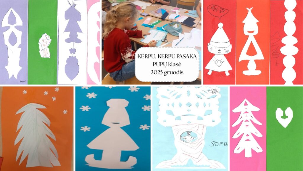 Pupų klasė buvo pilna šurmulio, laukimo ir… popieriaus skiautelių. Mokiniai darbavosi – kas skirtuką knygelei karpiniu papuošė, kas paveikslėlį ar snaigę iškirpo. Mokytoja Jūratė dėkoja mamytėms Lilijai ir Rūtai už pagalbą!