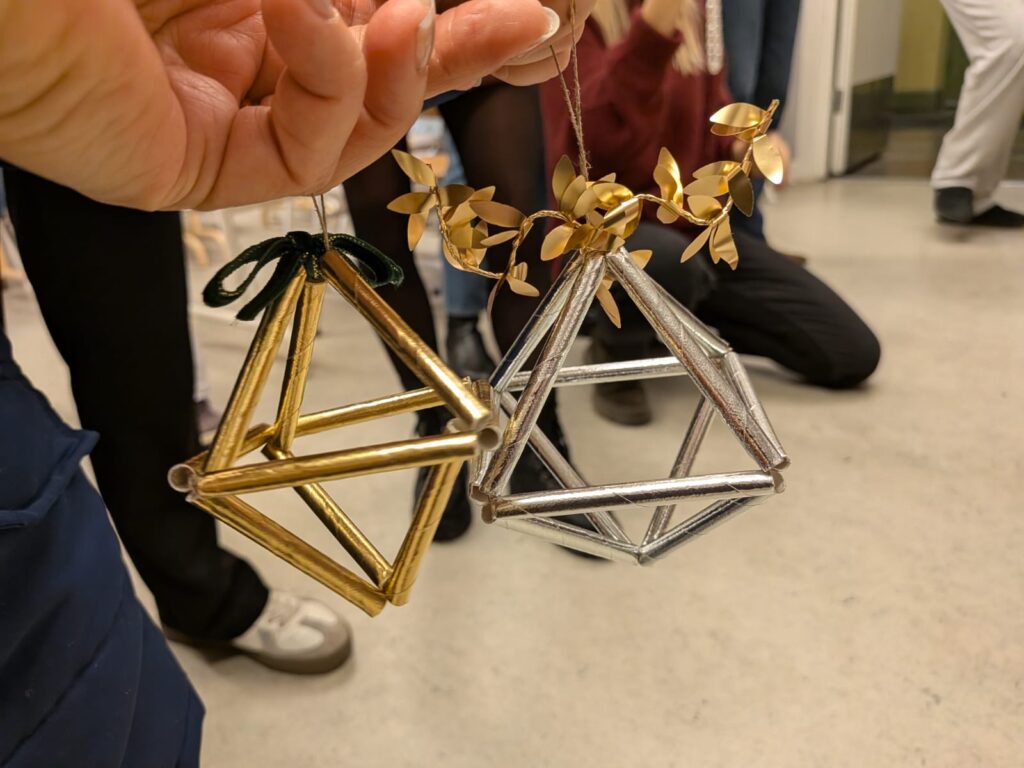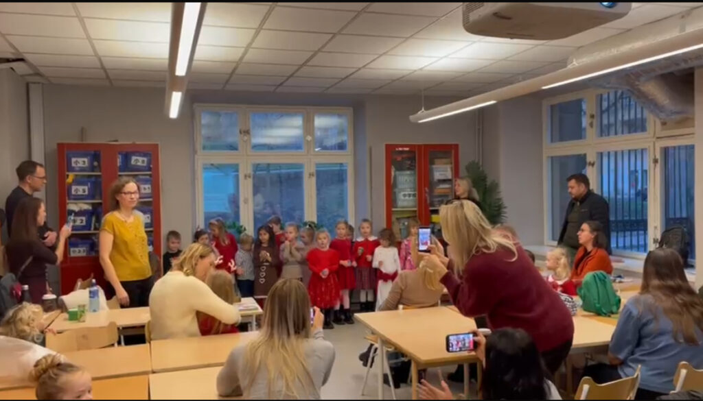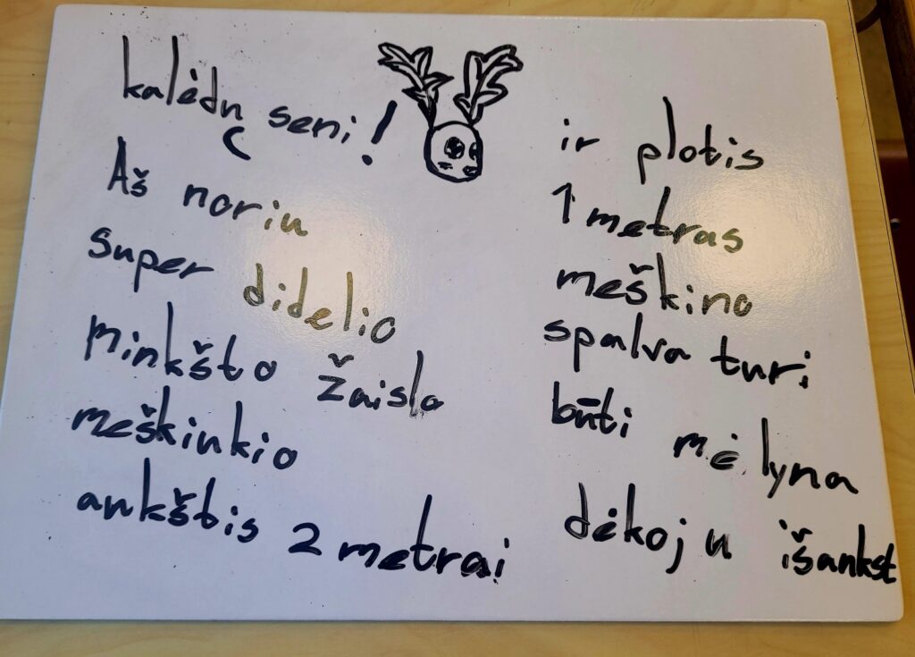 Jau tradicija tapo Gilių klasės apsilankymas kitose klasėse – šį kartą vaikai su mokytoja Karolina padainavo net tris dainas: Bernelis gimė Betliejuje, Kam, tavo vilkeli ir Džiaugsmingų šventų Kalėdų. Šios dainos atspindi plačią lietuviškų kalėdinę tradiciją – nuo ikikrikščioniškos, katalikiškos iki šiuolaikinės populiariosios. Vaikai taip pat gamino eglutės žaisliukus, naudodami tradicinio lietuviško sodo rišimo techniką.